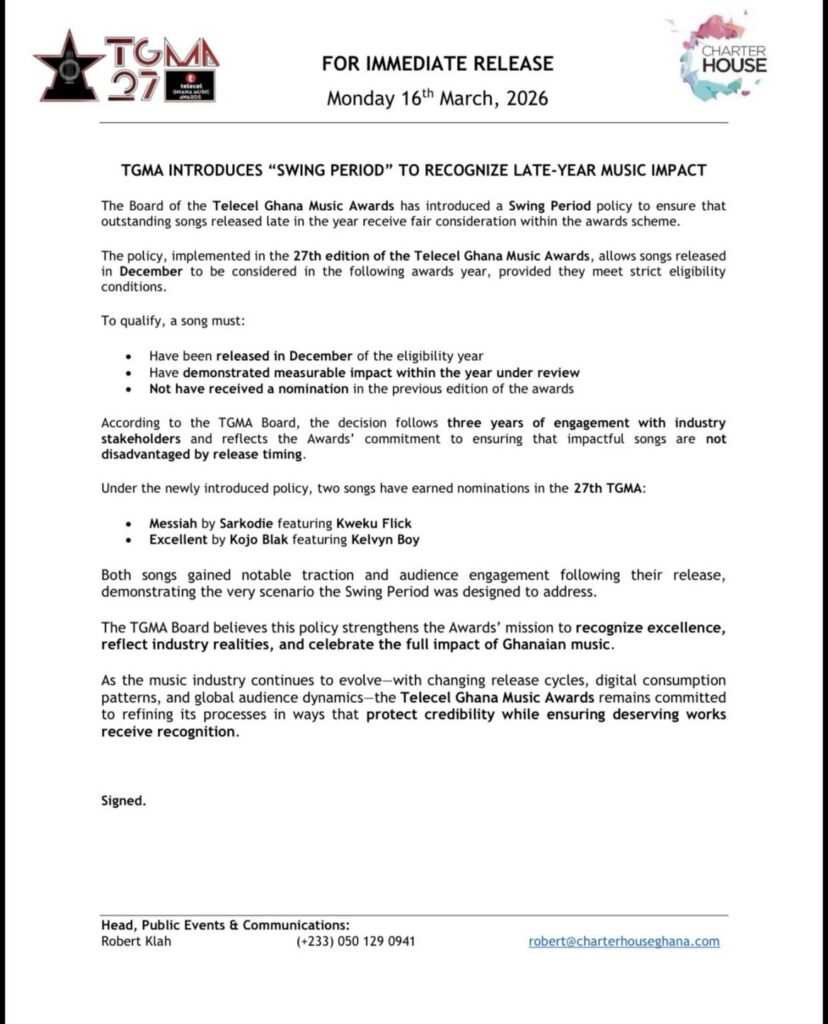To guarantee that exceptional songs released late in the year are given fair consideration within the awards system, the Telecel Ghana Music Awards Board has established a Swing Period policy. The policy, which was put into place during the 27th Telecel Ghana Music Awards ceremony, states that songs released in December are eligible for consideration in the next awards year as long as they adhere to certain criteria.