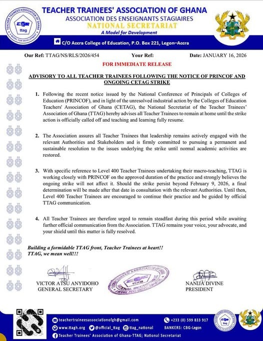 The Teacher Trainees’ Association of Ghana (TTAG) additionally reassured the Level 400 teacher trainees that their macro-teaching programme will continue despite the ongoing strike by the Colleges of Education Teachers Association of Ghana (CETAG).