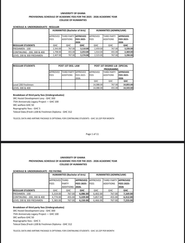 Following a considerable rise in academic expenses for the 2025/2026 academic year, with increases of more than 25% across all colleges, students at the University of Ghana are expressing concern.The provisional timetable of academic fees for the 2025/26 academic year reflects significant upward changes impacting both new and returning students, but the reasons for the dramatic hike have not yet been formally explained by university administration.